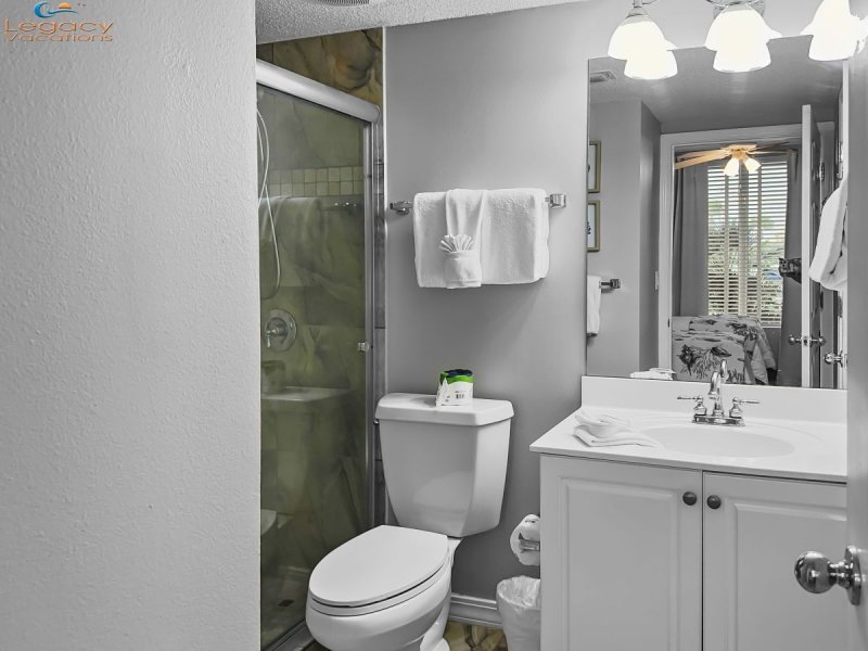 Relax on the charming outdoor patio, where you can unwind in the shade while keeping a watchful eye on your little ones splashing in the pool. The master bedroom features a king bed, a flat-screen TV, private patio access, and an en-suite bathroom. The second bedroom offers 2 twin beds and a private entrance to the second bathroom. Additionally, the living room is equipped with a brand-new queen sofa sleeper, perfect for accommodating extra guests.