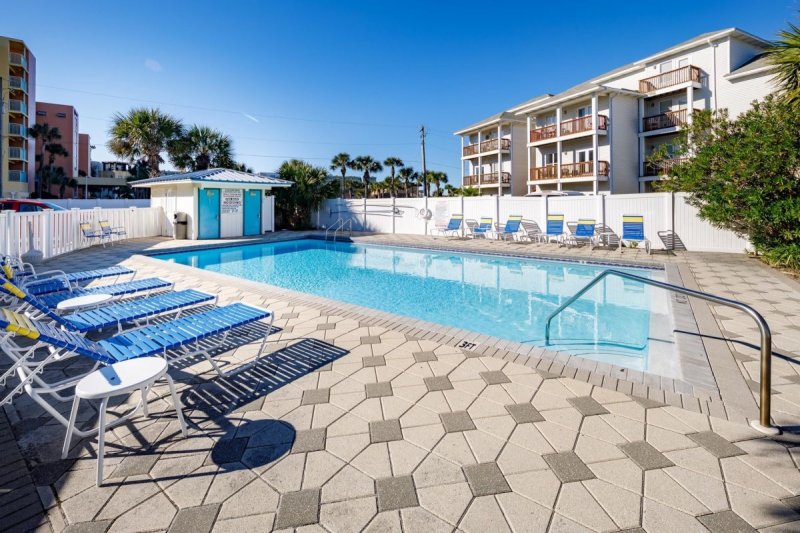 Resort amenities include a community pool, grill and picnic area, free parking, and complimentary seasonal beach service (umbrella & 2 chairs provided daily, March–October).