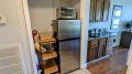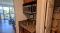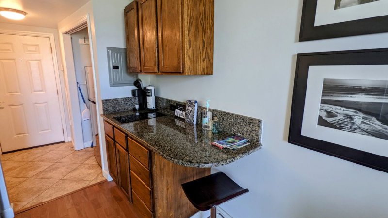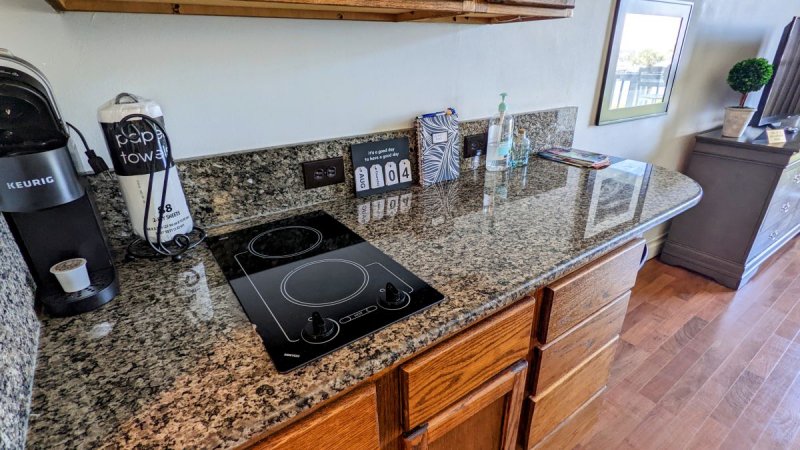 Kitchenette with a refrigerator/freezer, 2 burner glass stove top, toaster oven, microwave, and coffee maker